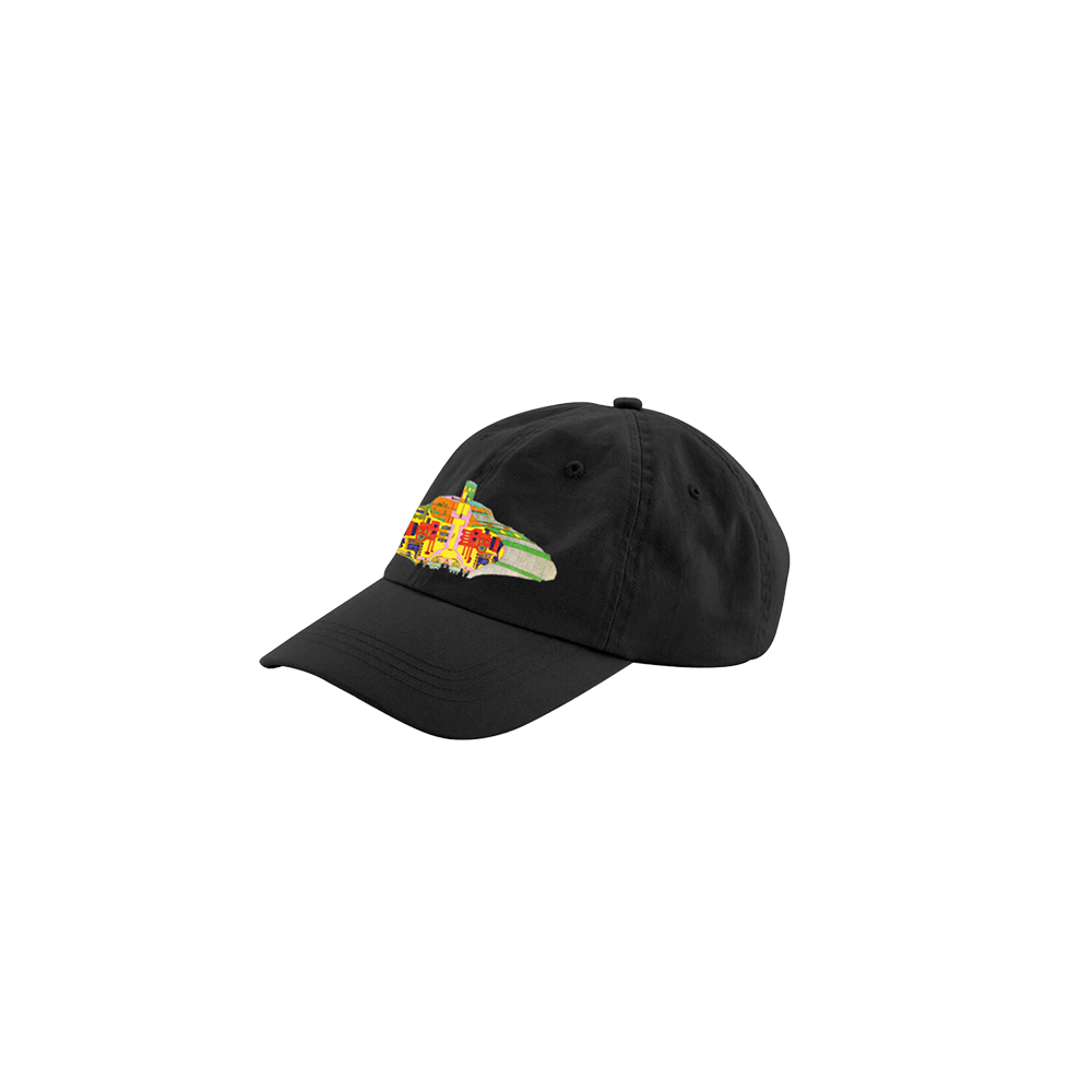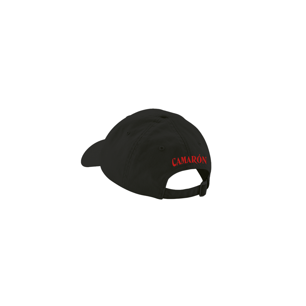 Gorra negra con diseño conmemorativo de la canción "Volando Voy" en la parte frontal y logo de Camarón en rojo en la parte trasera