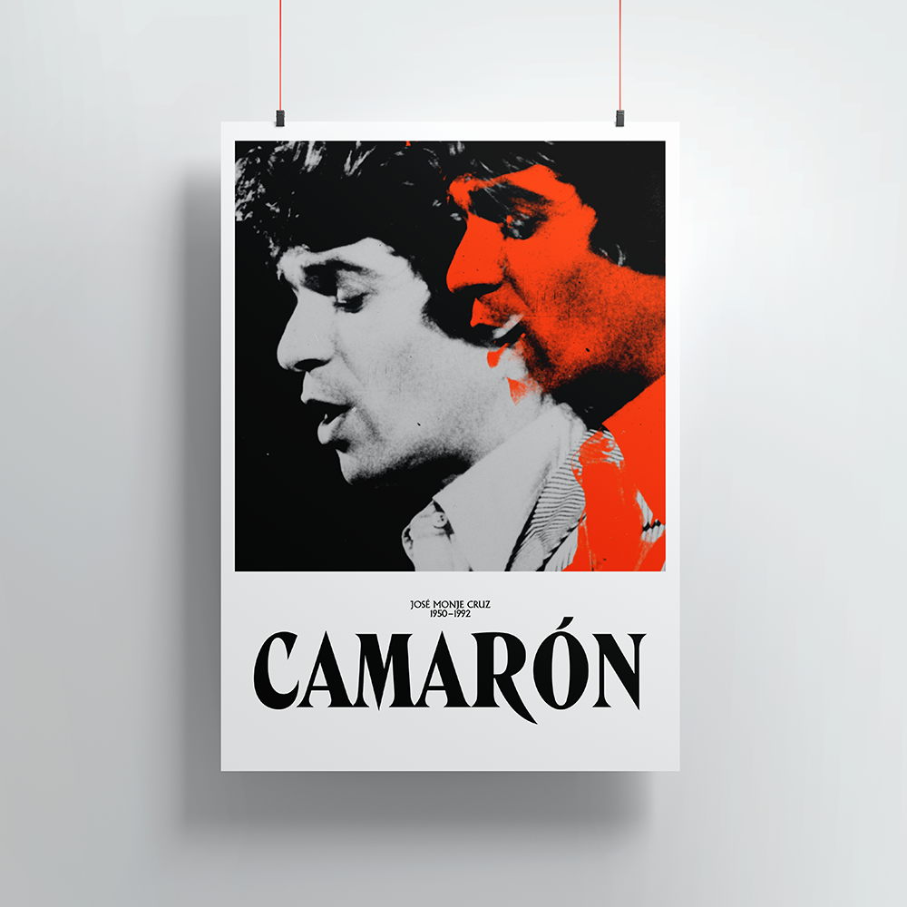 Póster conmemorativo de la vida de Camarón con un diseño inédito realizado desde una foto en blanco y negro del artista cantando.