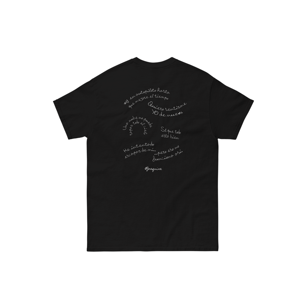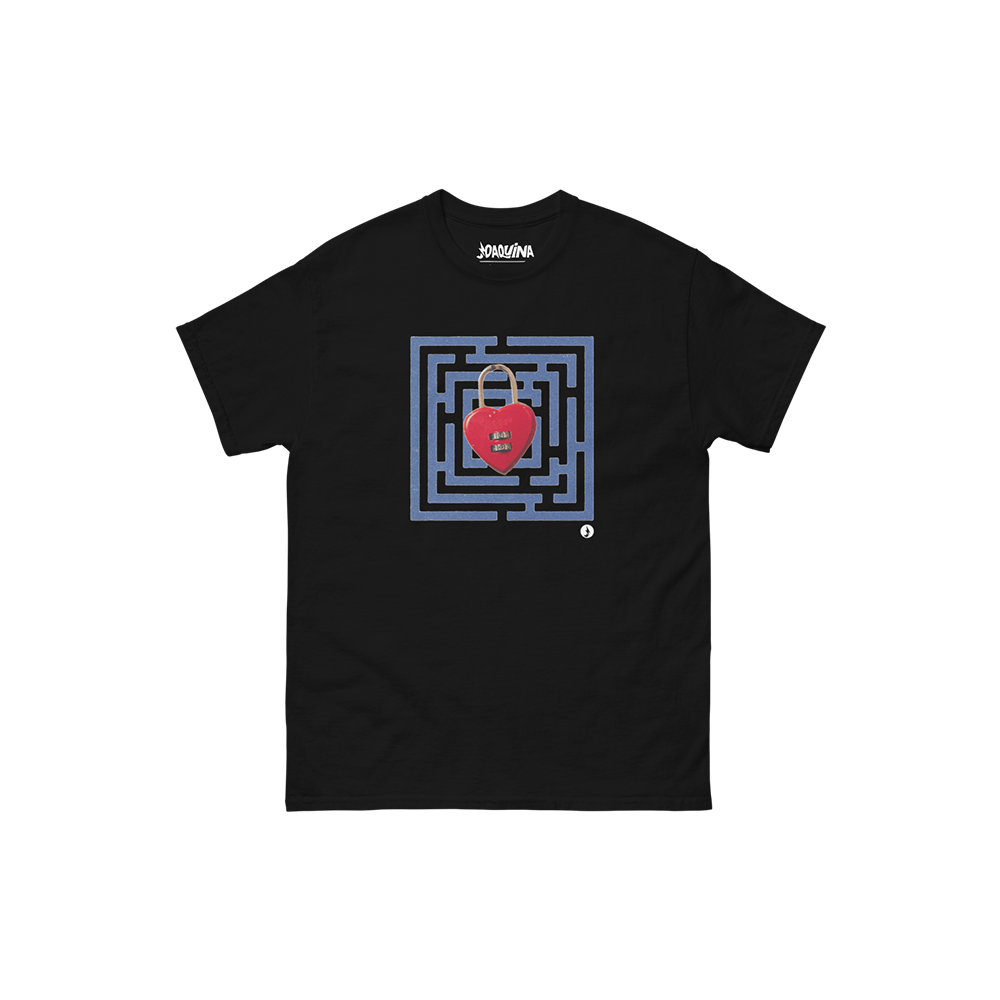 La camiseta oficial Escapar De Mí presenta el laberinto y el medallón en forma de corazón de la última canción de la cantautora Joaquina "Escapar de mí" con letras de la canción en la parte posterior de la camiseta negra.