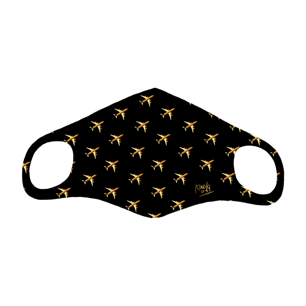 Mascarilla negra con diseño de aviones dorados y firma Karol G en lateral inferior izquierdo.