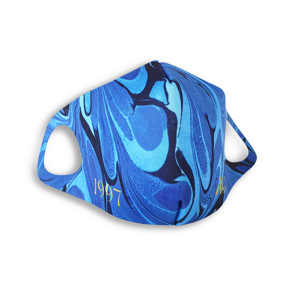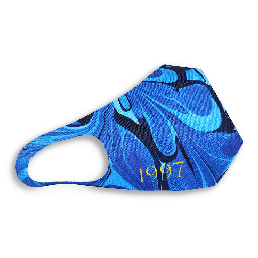Mascarilla con el estampado tie dye de la portada de 1997.