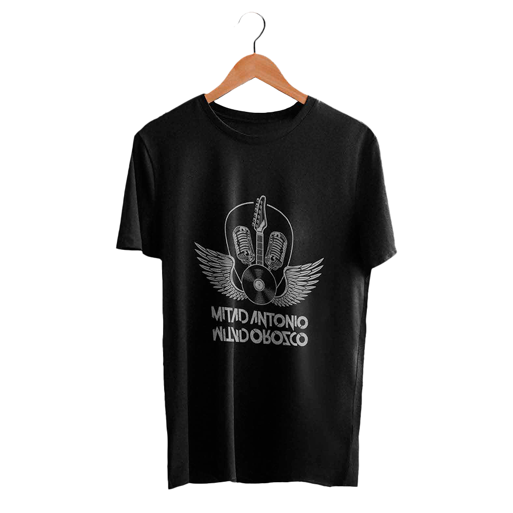 Camiseta de algodón en color negro con marcaje en la parte delantera. Composición de elementos gráficos y tipográficos que combina el nombre del artista con un montaje formado por un vinilo, dos micrófonos y un mástil de guitarra eléctrica.