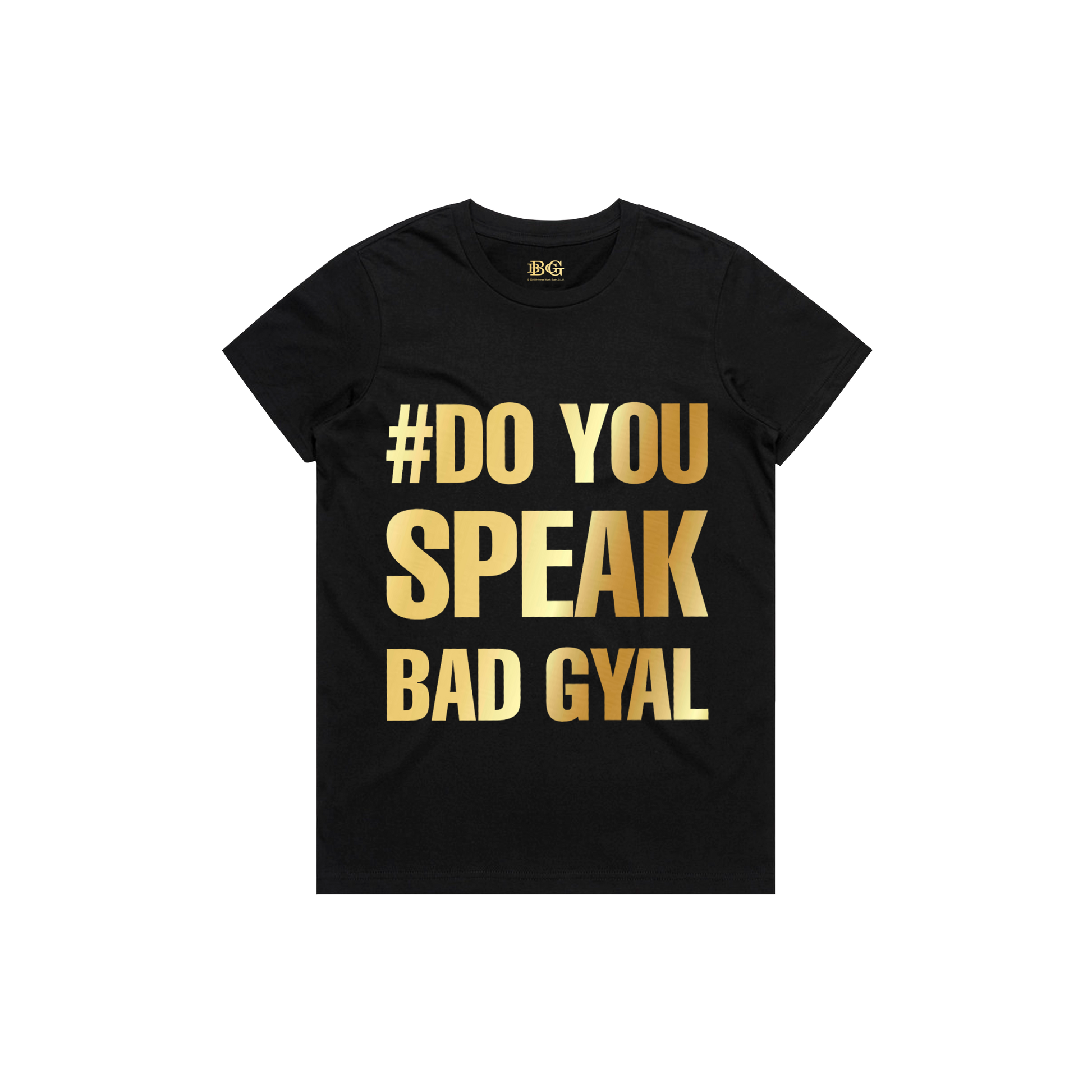 Camiseta negra con la frase “DO YOU SPEAK BAD GYAL” en dorado. Para quienes entienden el código, no es una pregunta, es un idioma.