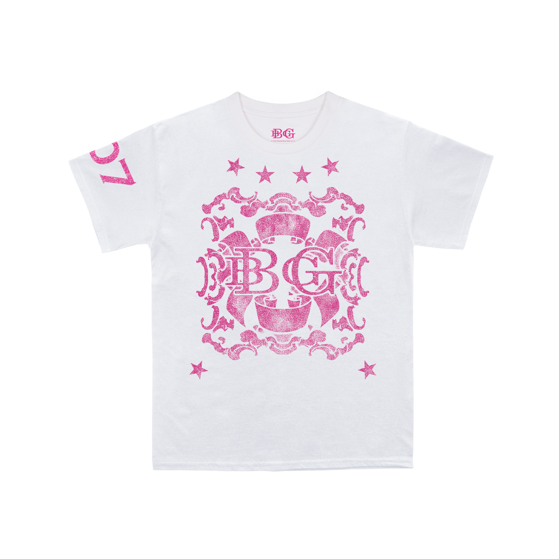 Camiseta blanca con emblema BG en rosa, estrellas y detalle 07 en la manga.