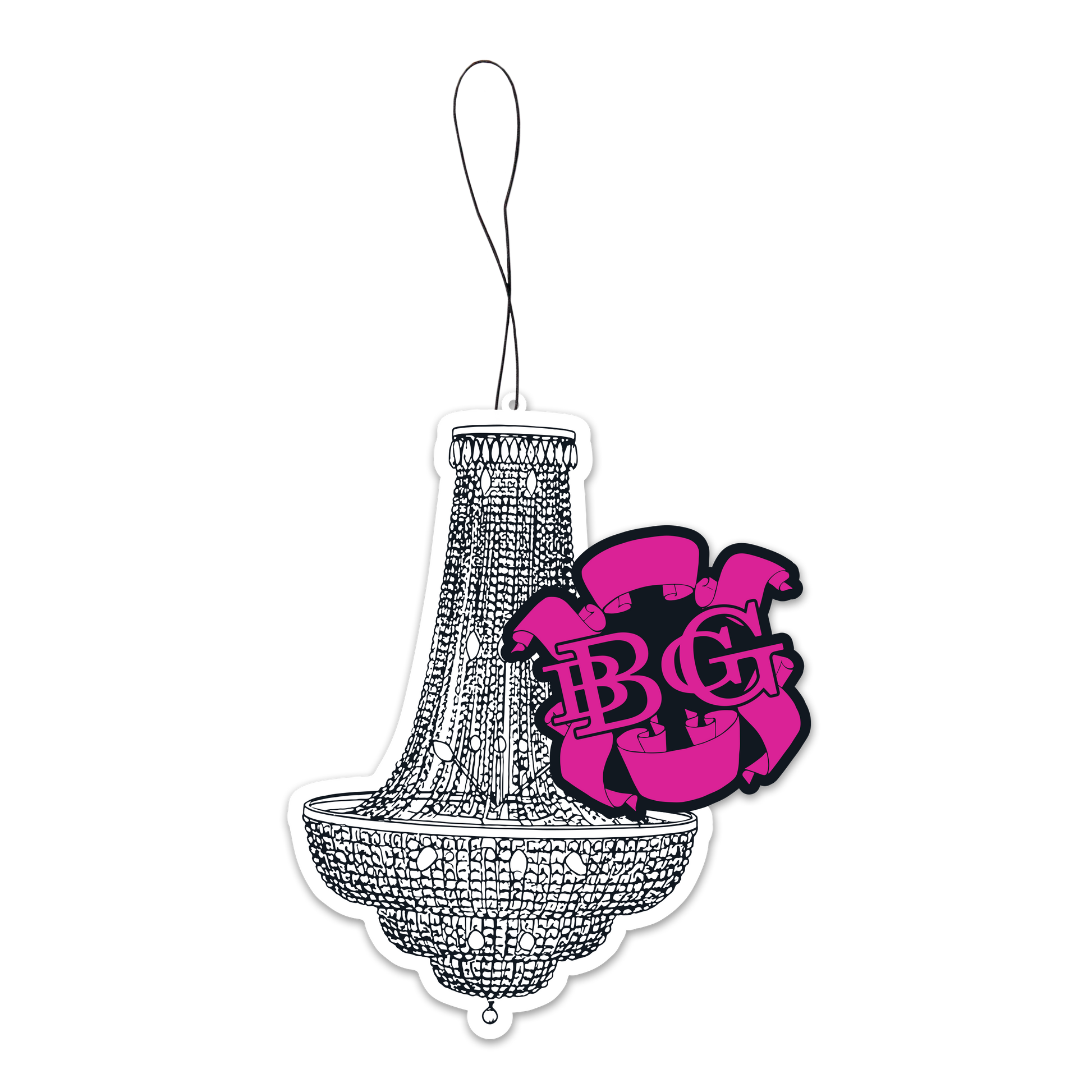 Ambientador en forma de lámpara de araña, con emblema BG en rosa y aroma ámbar. Cálido, envolvente y adictivo.