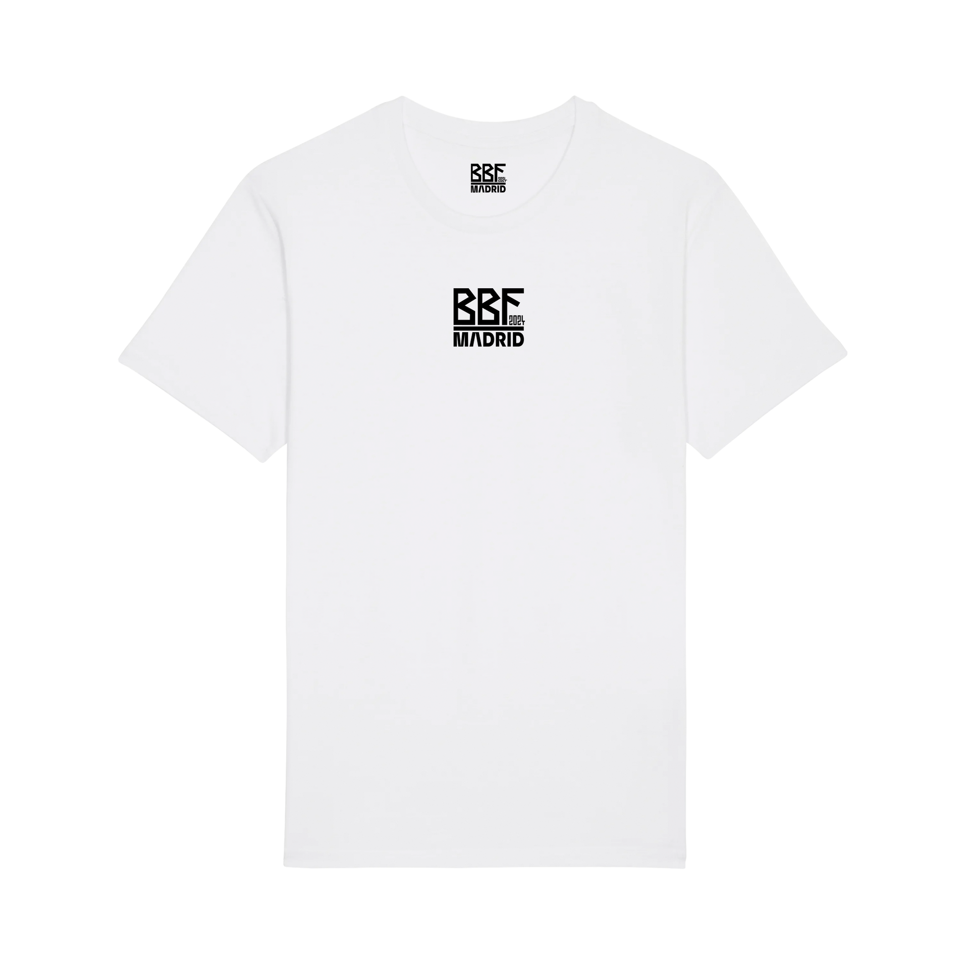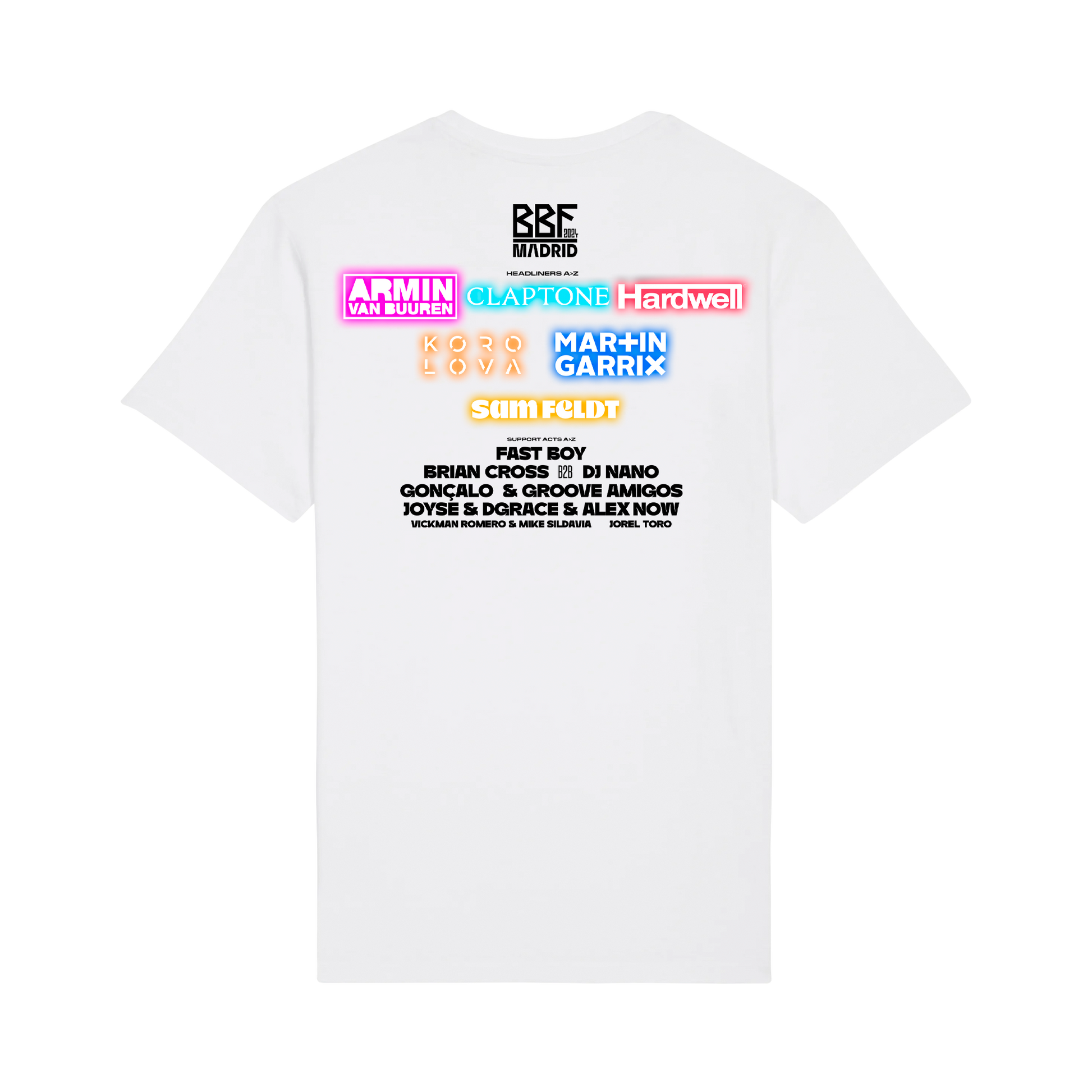 Camiseta blanca con el lineup oficial del BBF Madrid 2024.
