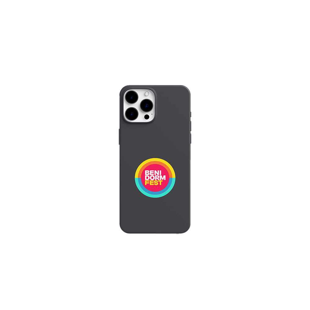 Funda de móvil negra con ícono multicolor del Benidorm Fest 2024. Disponible en varios modelos.