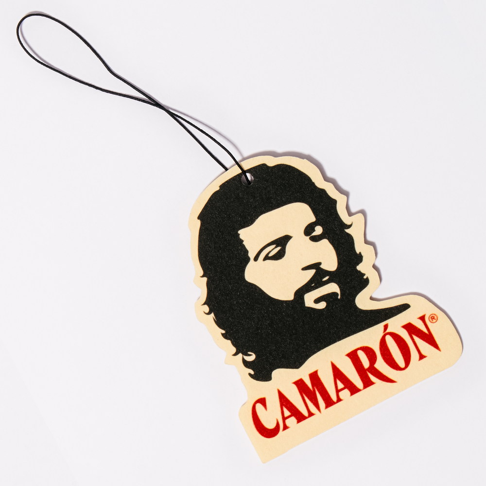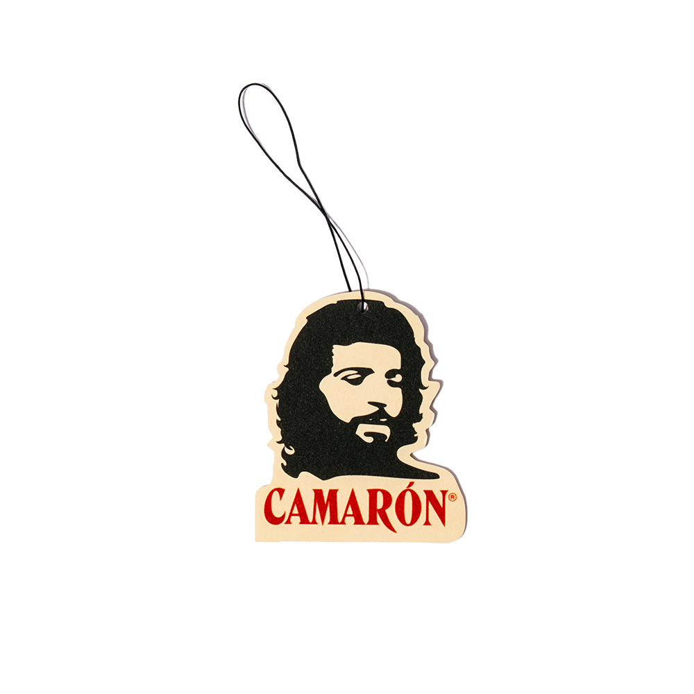 Ambientador de coche con diseño compuesto por la silueta de Camarón de la Isla en negro y el logo de "Camarón" en rojo.