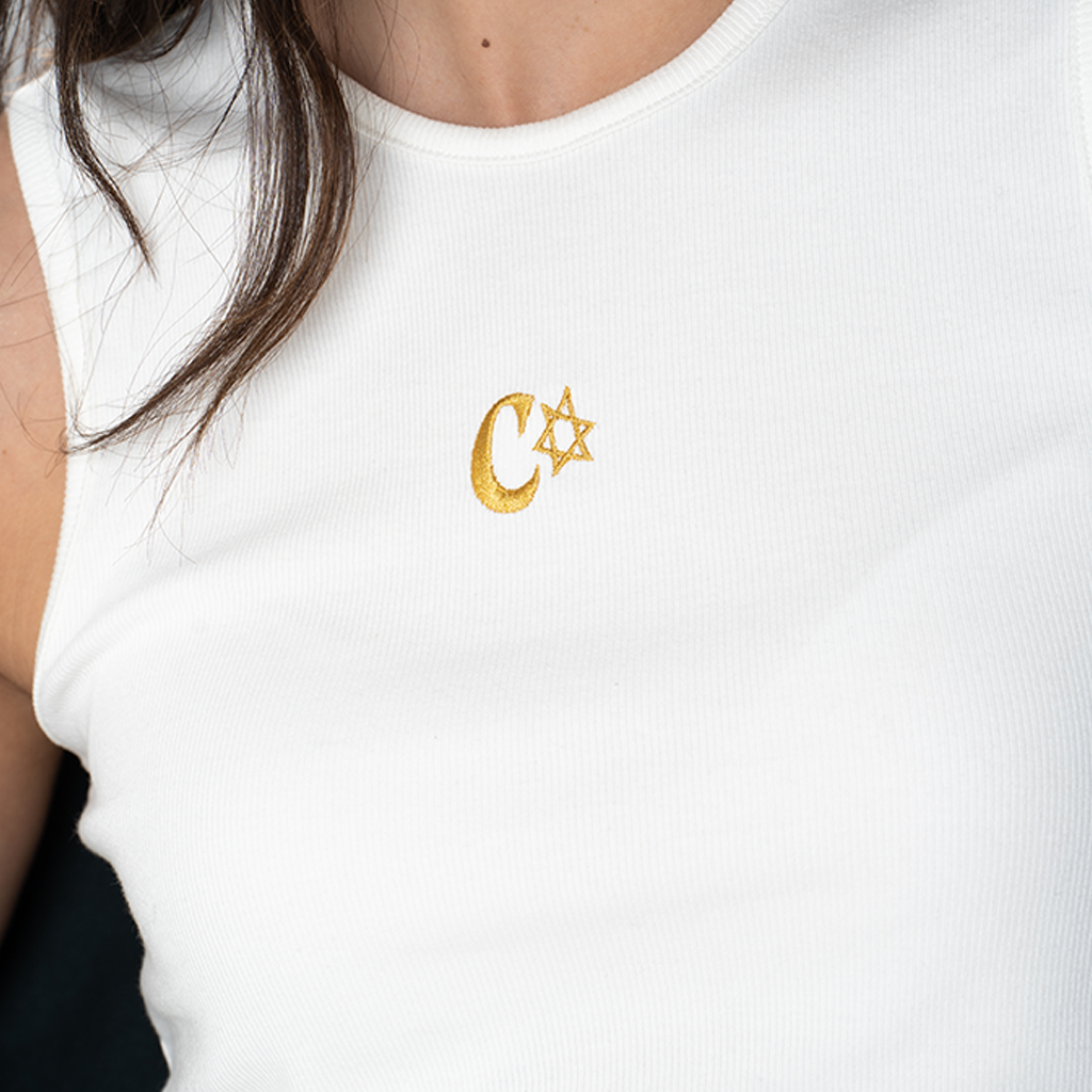 Camiseta de canalé blanca de tirantes con el logotipo de Camarón de la Isla bordado en el centro del pecho en hilo dorado.