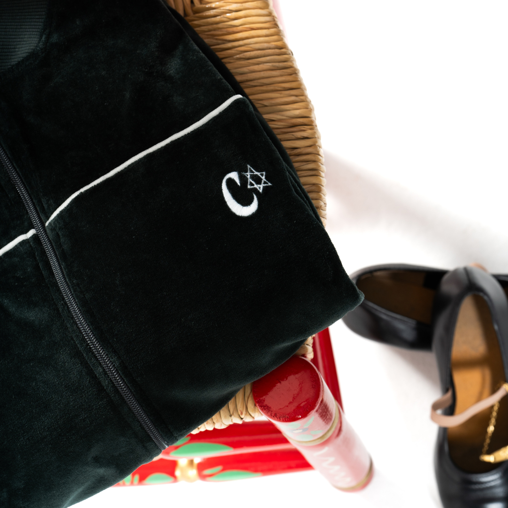 Chaqueta de manga larga con cremallera color verde botella con el logo de Camarón de la Isla bordado en blanco en el pecho. Bolsillos a ambos lados con cierre de cremallera. Tacto terciopelo.