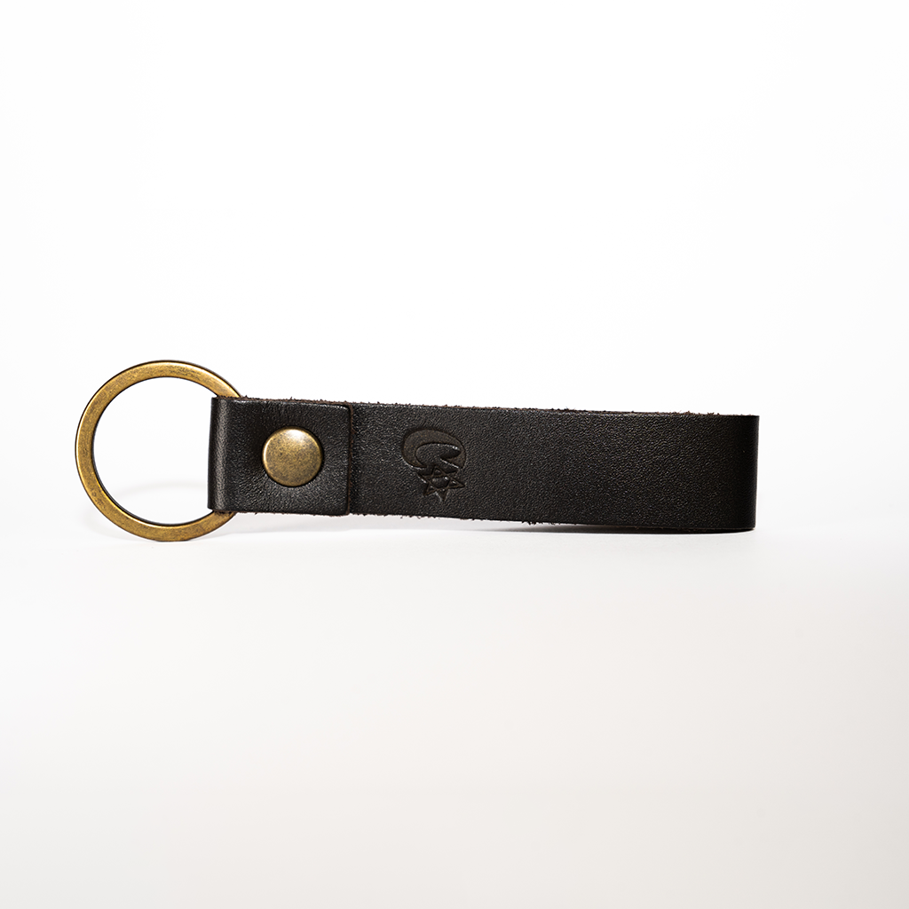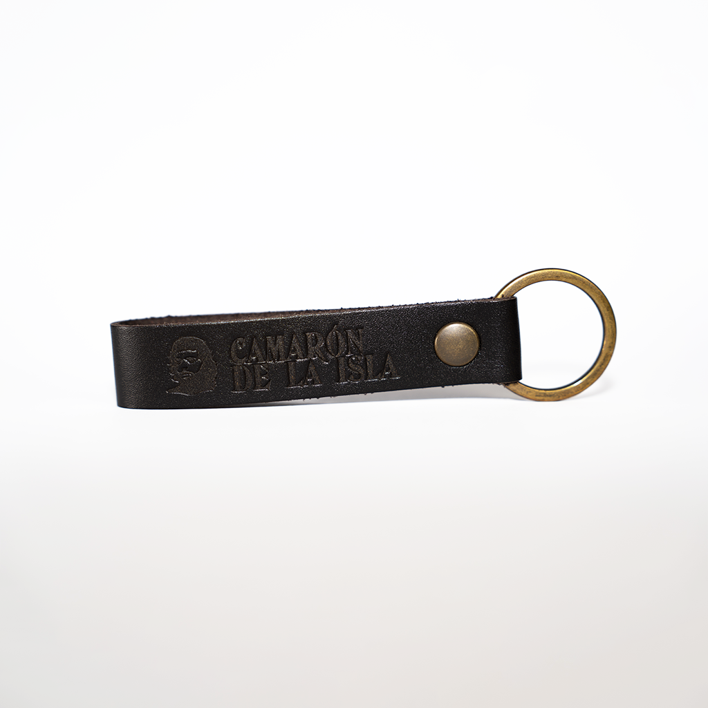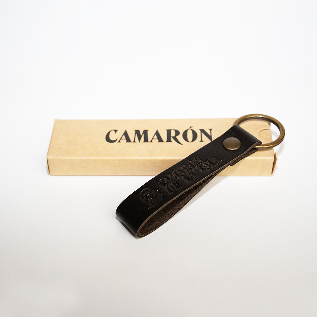 Llavero de cuero color negro con marcaje en golpe seco de la silueta de Camarón y "Camarón de la Isla" en una cara y el logo de la "C" y la estrella por el otro.