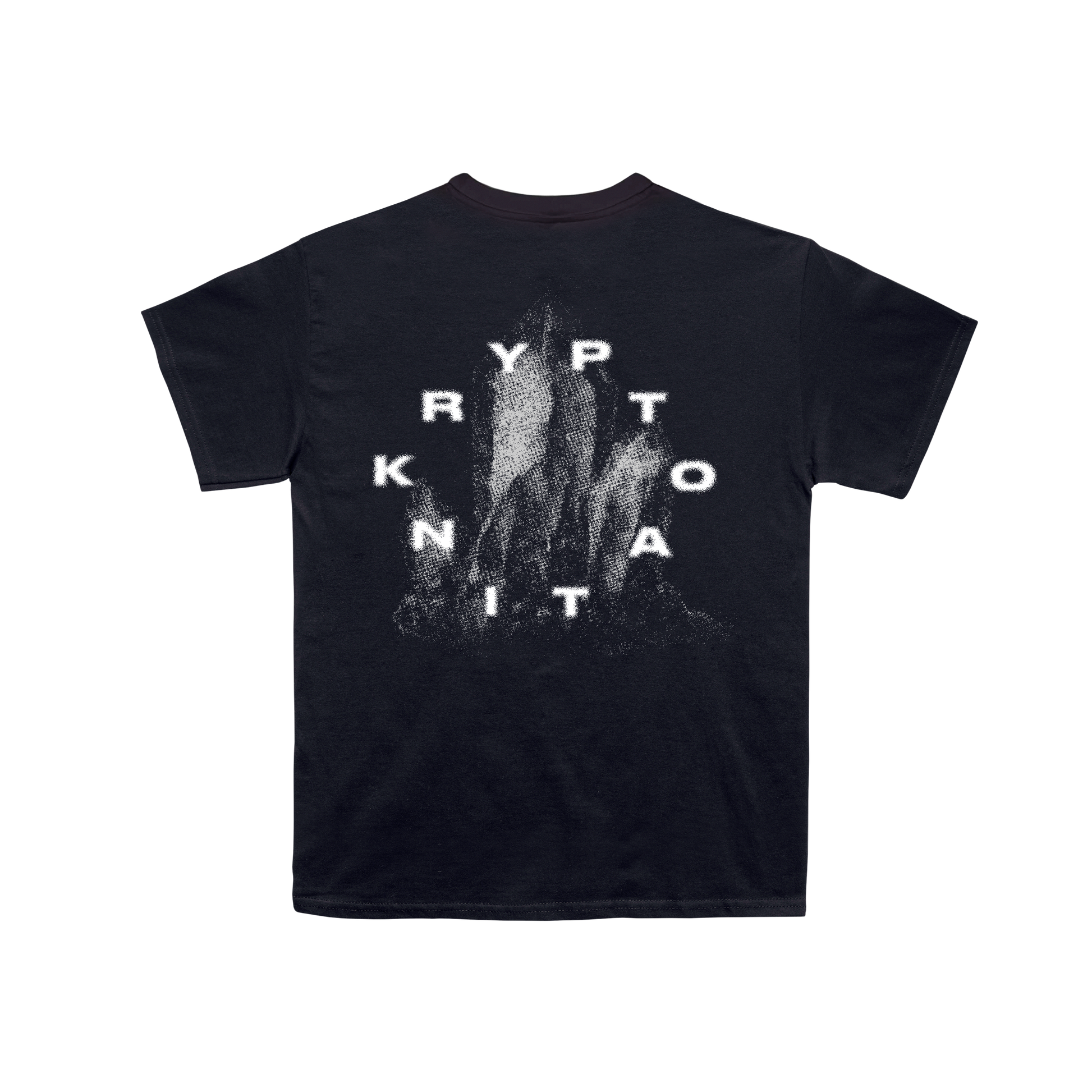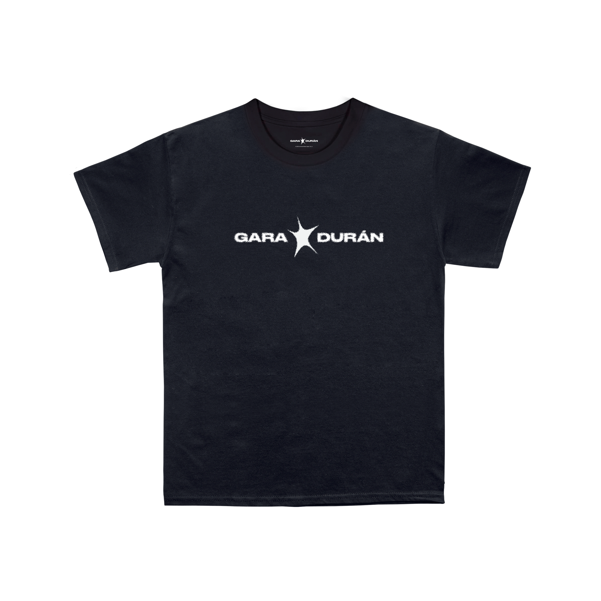 Camiseta negra con el nombre de Gara Durán en la parte delantera e ilustración en blanco y negro de su canción "Kryptonita" en la trasera.