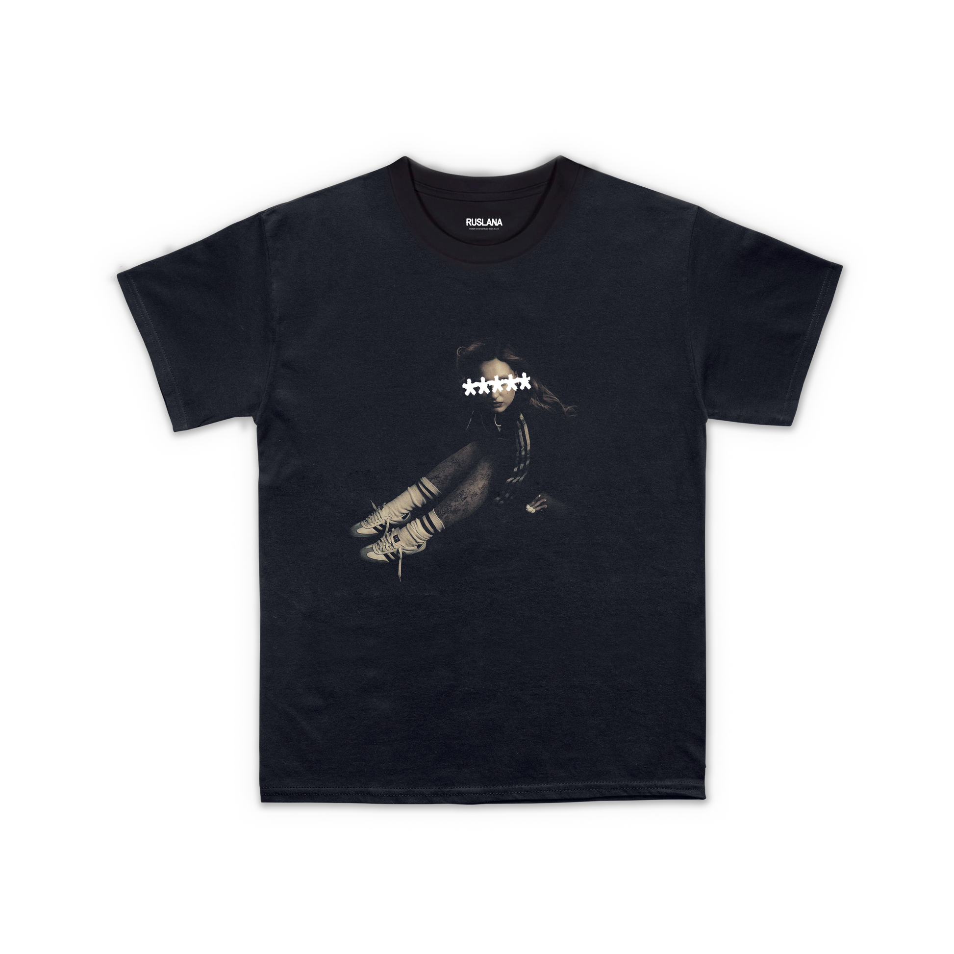 Camiseta negra con diseño fotográfico de Ruslana en la parte frontal. Arte y actitud en una misma prenda.