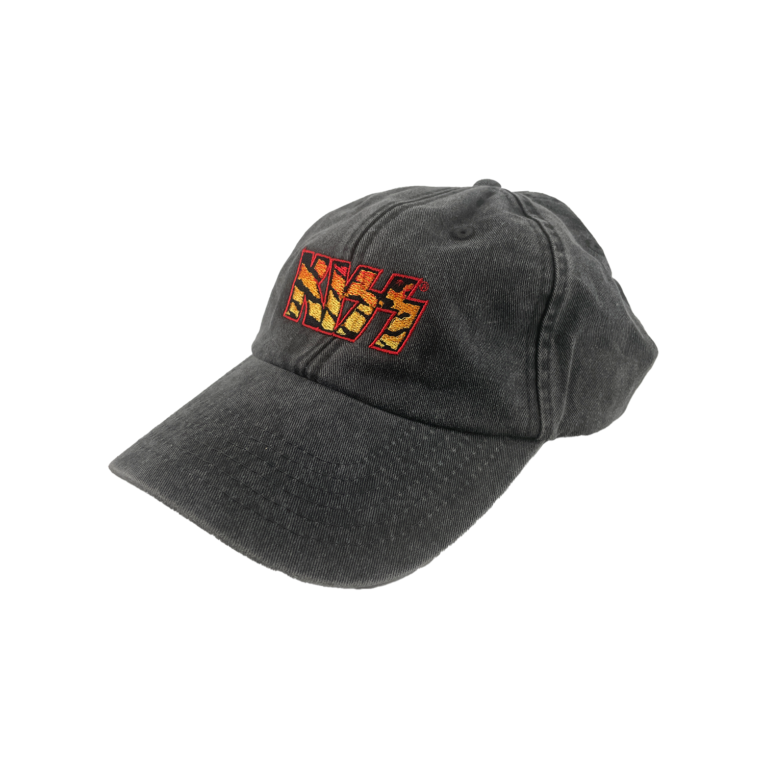 Gorra gris vintage con logo de KISS en estampado de tigre.