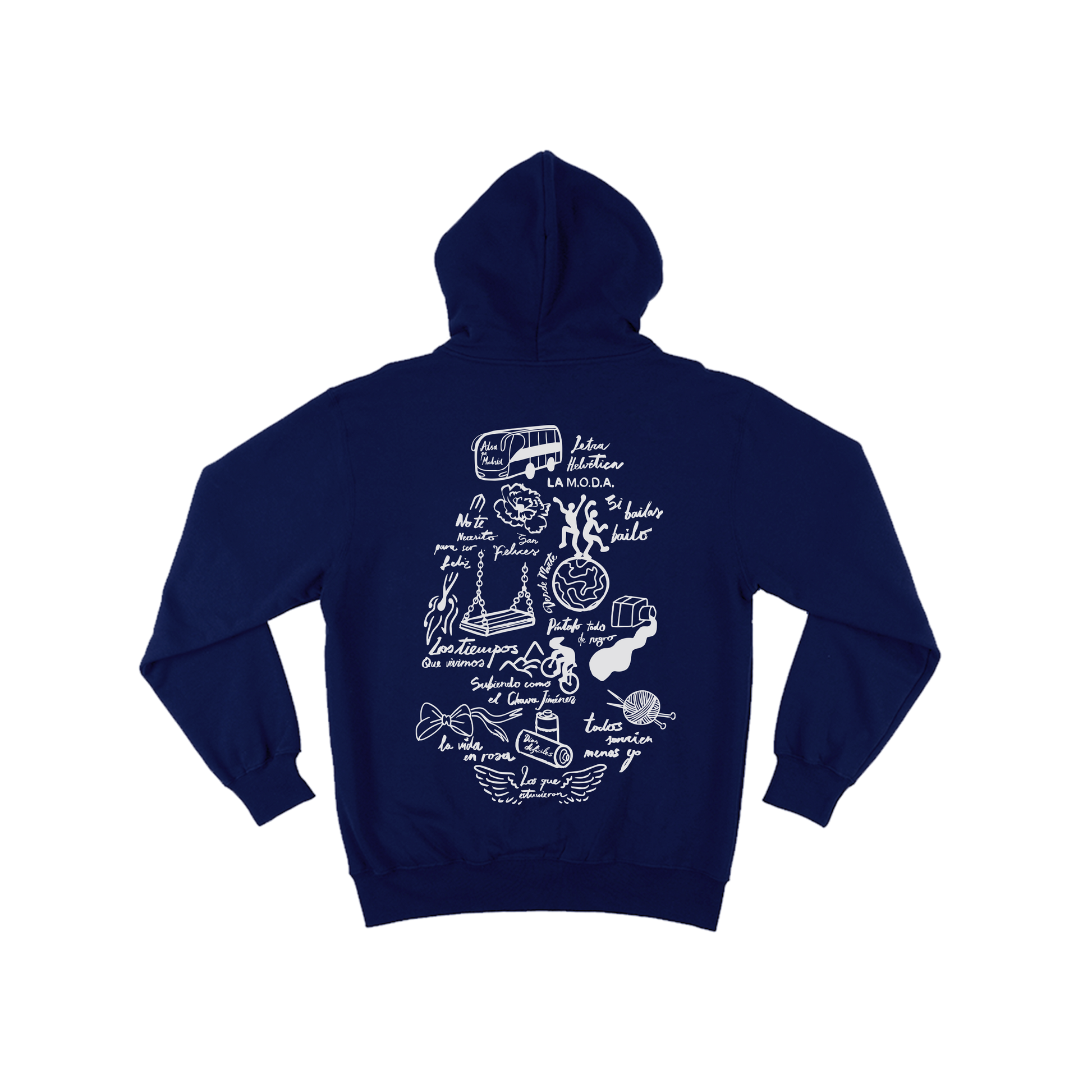 Sudadera navy con logo oficial de La Maravillosa Orquesta del Alcohol en la parte delantera e ilustración exclusiva del álbum “San Felices” en la trasera.