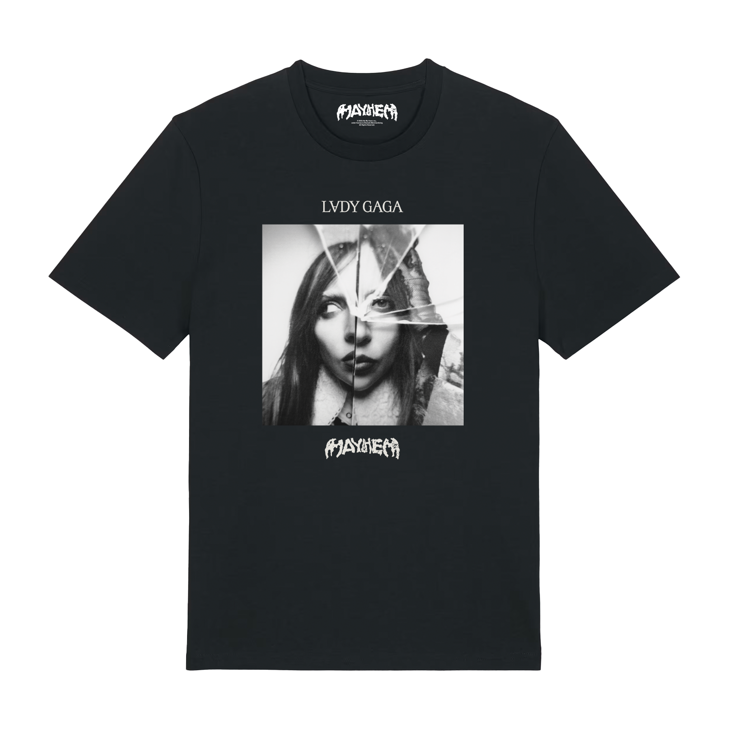 Camiseta negra con fotografía de Lady Gaga en blanco y negro, y nombre del álbum "MAYHEM".