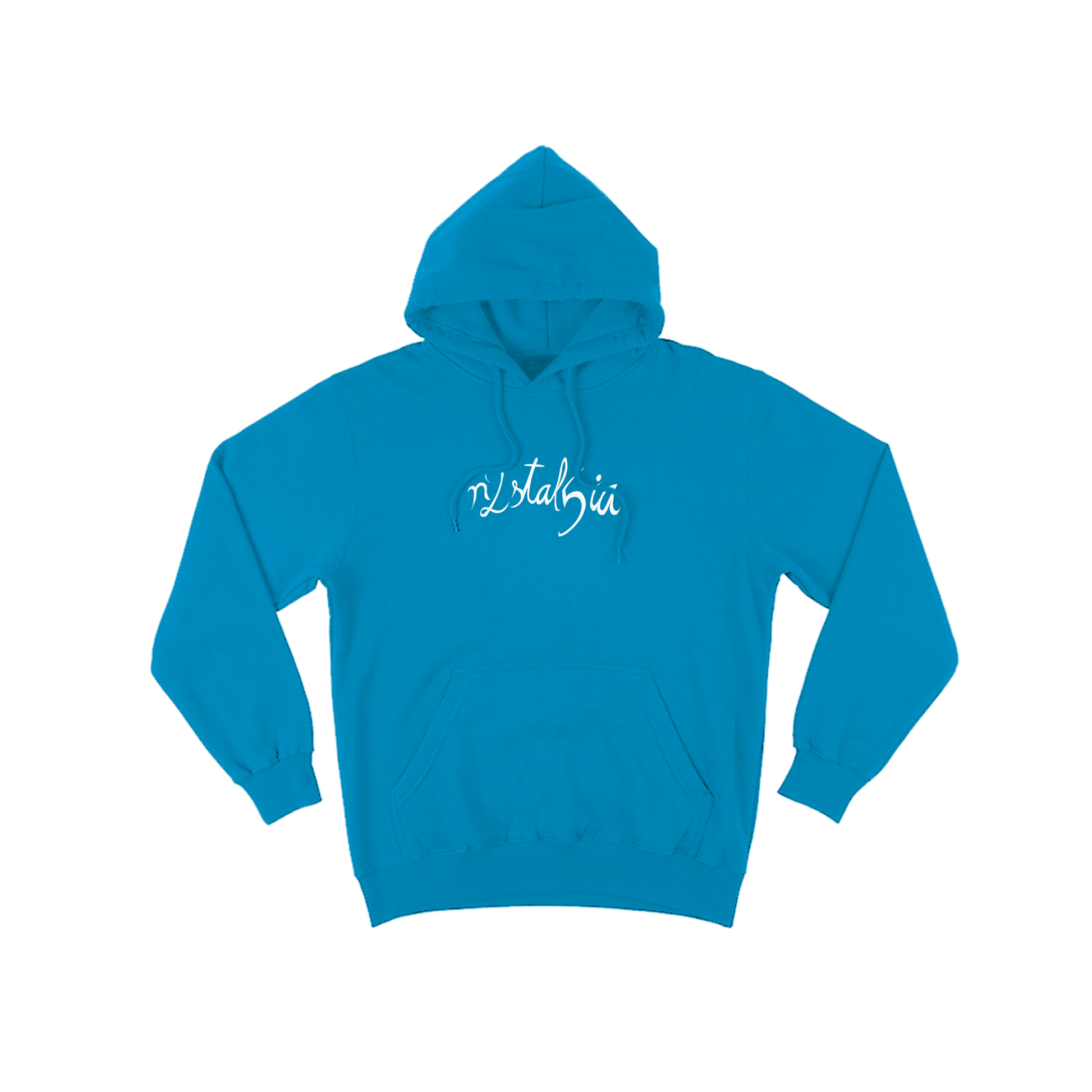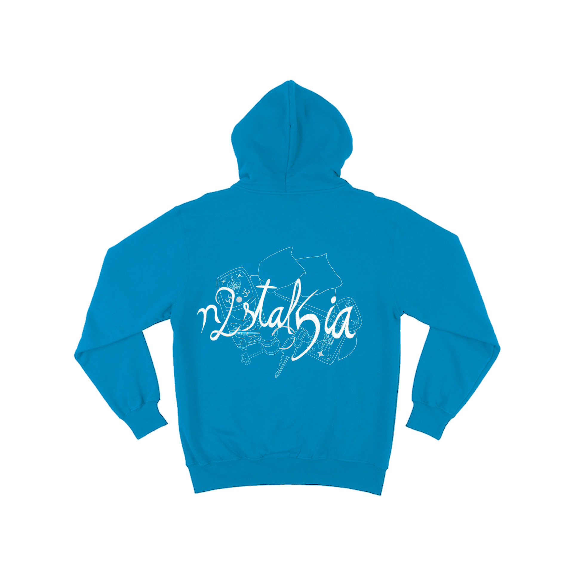 Sudadera oficial azul con el título del álbum “N2STAL5IA” al frente y un diseño minimalista en la espalda. 🌊🕊