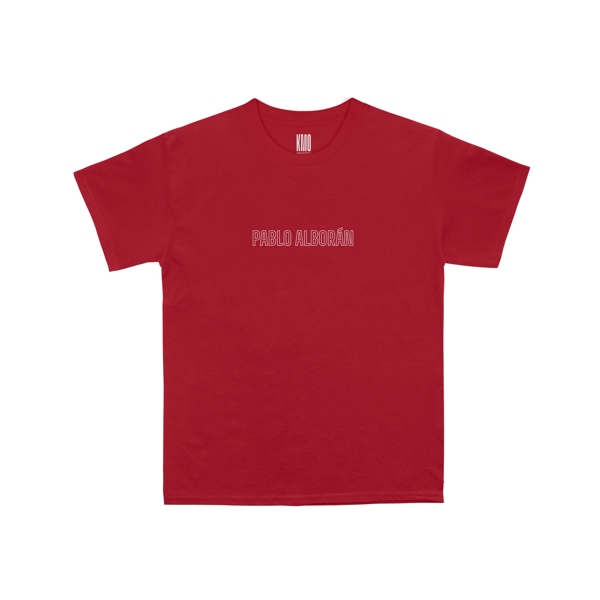 Camiseta roja edición especial del álbum "KM0" de Pablo Alborán. Presenta el nombre del artista en blanco en el frente y el emblema “KM0” en la parte posterior.