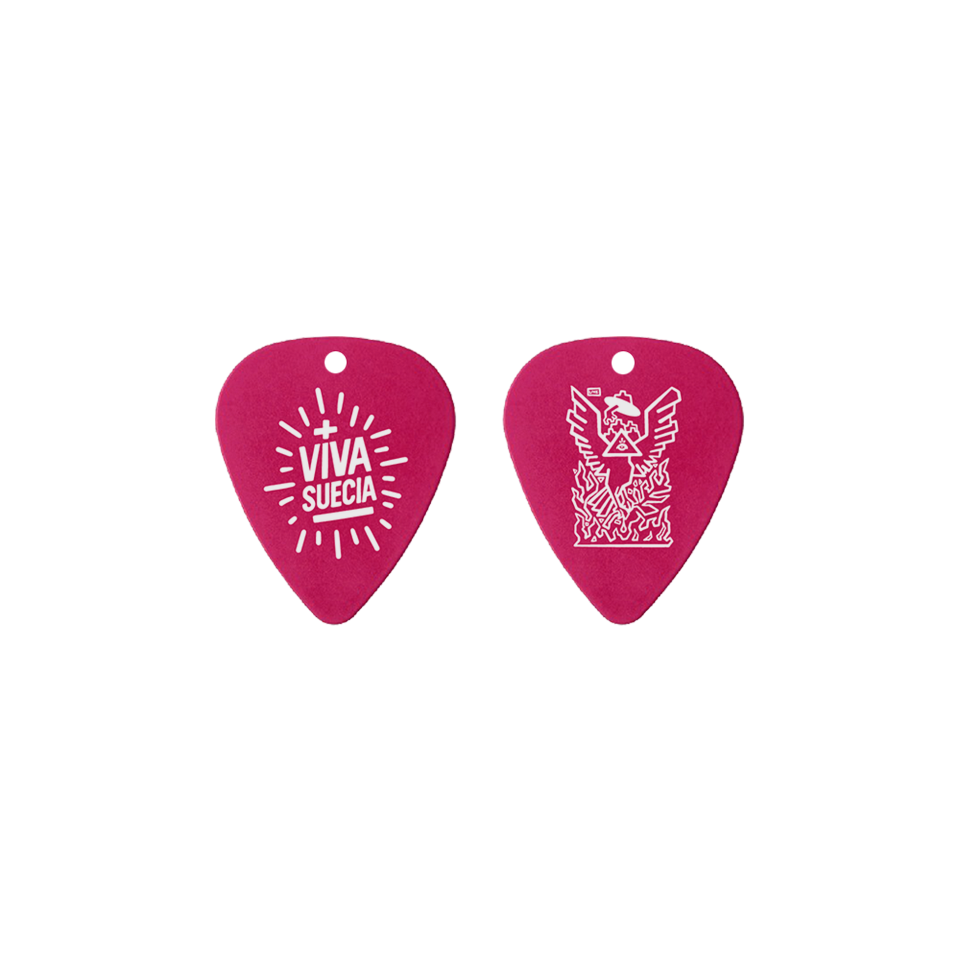 La púa oficial de Viva Suecia, diseñada con la estética de "Hecho en Tiempos de Paz".